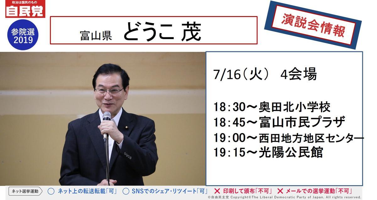 どうこ茂個人演説会のお知らせ 鋪田博紀 令和1年7月15日(月) インフォメーション タグ: どうこ茂, 個人演説会, 堂故茂 トラックバック(0) 7月16日個人演説会日程 7月16日(火)のどうこ茂候補の個人演説会のお知らせです。 私は、19:00開始の西田地方地区センターと、19:15開始の光陽公民館(地区センター)の二か所で弁士を務めます。皆様のご来場を心からお待ちしています。 順番会場名開始時刻 第1会場奥田北小学校18:30 第2会場市民プラザ18:45 第3会場西田地方地区センター19:00 第4会場光陽公民館(地区センター)19:15 Tweet