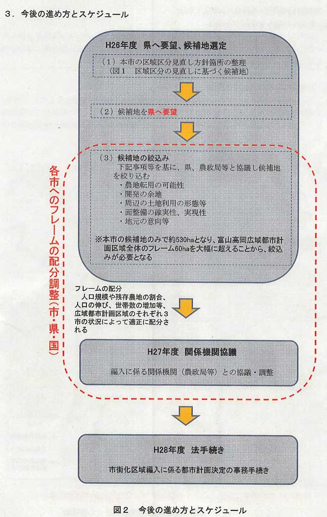 富山高岡広域都市計画マスタープランの見直し作業が平成26年8月のマスタープランの都市計画決定、平成28年の市街化区域編入などの事務手続きに向け進められていますが、このことについて、昨年末から、富山県、富山市、射水市、高岡市の考え方の違いが浮き彫りになってきました。