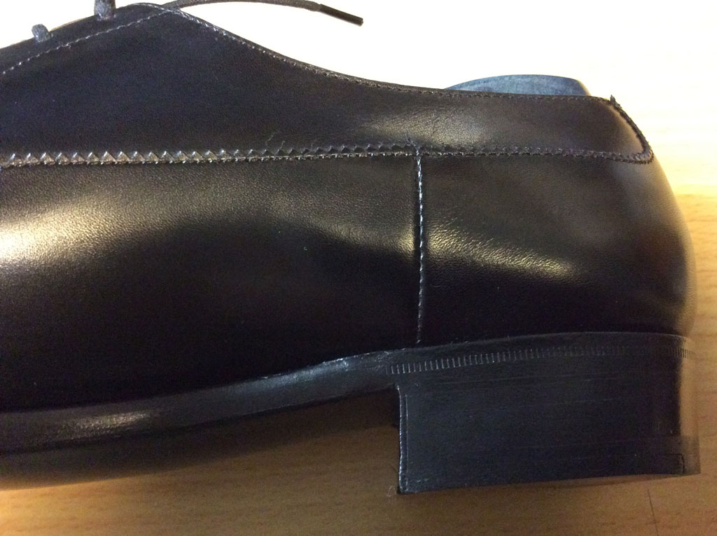 ビスポークシューズ(誂え靴)のオックスフォード(内羽根)ではたまに見ることが出来る、羽根の切り返しが踵まで水平に伸びているデザインです。