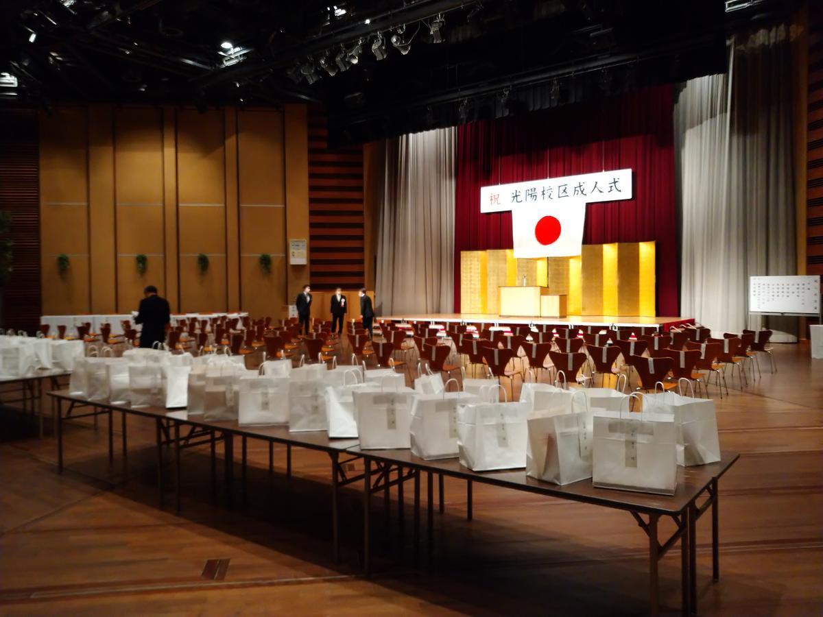 各地で成人式の開催が見送られる中で、光陽校区成人式は恩師を囲む会などの懇親行事を省略して開催しました。いつもの小学校体育館では設営時の感染リスクがあることや、当日の感染リスクを少しでも減らすために、様々な装備やノウハウがある、とやま自遊館に会場を移すことになりました。