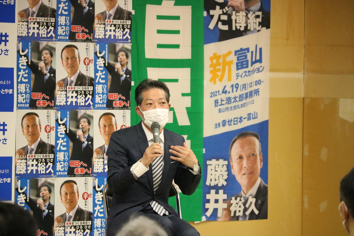4月4日(日)に藤井裕久(元富山県議会議員)氏をお迎えし、「幸せ日本一とやま!!討論会」と題した討論会を開催したところ、あいにくの天気の中、およそ90名もの方にご参加いただきました。本当にありがとうございます。