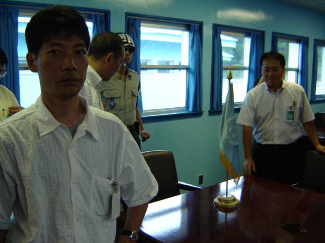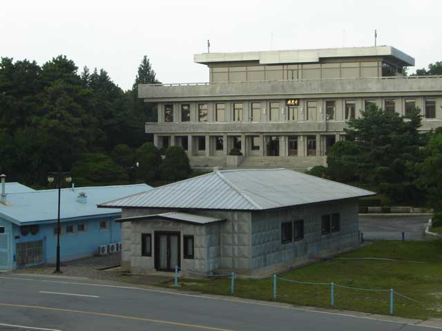 私の向こうに見えるのは北朝鮮が管理する建物。手前の平屋の建物のうち青いのが国連軍側(韓国側)が管理する建物、灰色のほうは北朝鮮側が管理する建物になっています。